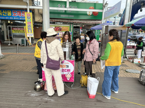 | 김천시종합자원봉사센터(센터장 김경희)에서는 전통시장의 활기를 북돋아 주고자 온누리봉사단(회장 이숙이)과 여성대학봉사단(회장 배낙임)은 지난 4월 10일 오일장 평화시장 만남의 광장에서 따뜻한 음료 제공과 민속경기로 시장을 찾은 시민들에게 행복함을 안겨주었다.