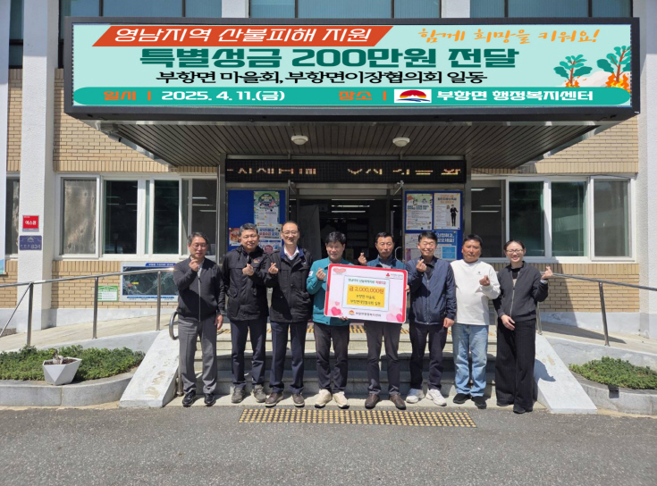 | 김천시 부항면 17개 마을회와 이장협의회(회장 신춘식) 일동은 지난 4월 11일 영남 지역 산불 피해 지원을 위한 특별성금을 전달했다. 마을회 일동이 170만 원, 이장협의회가 30만 원을 보태어 총 200만 원의 따뜻한 마음이 모였다.