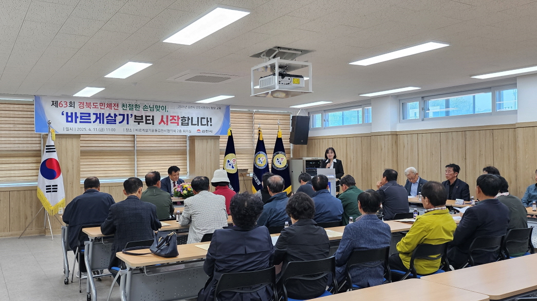 시는 제63회 경북도민체육대회 등의 성공적인 개최와 친절한 손님맞이를 준비하기 위해 체전 종사자, 자원봉사자뿐만 아니라 일반 시민을 대상으로 선진시민의식 함양 교육을 진행하고 있다. 그 첫 번째 교육에 바르게살기운동김천시협의회 임원진, 읍면동 위원장 등 40여 명의 회원이 참여했다.