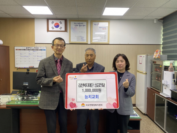 | 김천시 어모면 능치교회는 4월 14일 어모면 행정복지센터를 방문하여 저소득층 및 복지 사각지대를 위한 성금 100만 원을 김천복지재단에 기부했다.