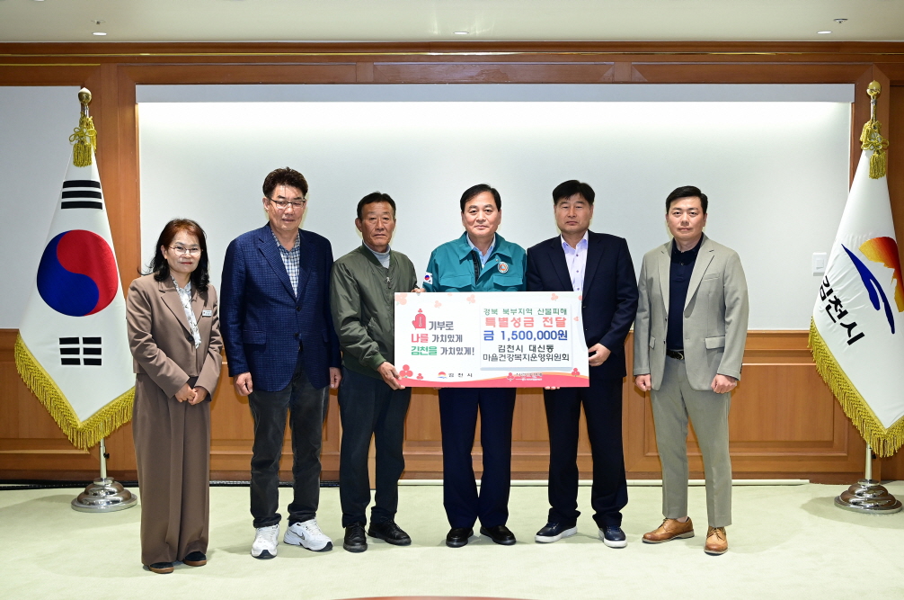 | 김천시 대신동 마을건강복지 운영위원회(위원장 한윤태)는 지난 4월 14일 김천시청을 방문해 영남 지역 산불 피해 복구를 위한 특별성금 150만 원을 기부했다.