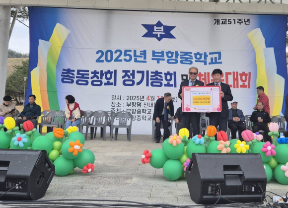 | 김천시 부항중학교 5회 동기회 일동은 지난 4월 12일 영남 지역 산불 피해 지원을 위한 특별성금 100만 원을 전달했다. 부항중학교 총동창회에서 주관한 이날 전달식은 부항중학교 출신 졸업생 500여 명이 모인 가운데 부항면 산내들 공원에서 이루어졌다.