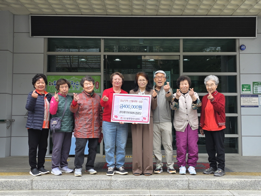 이해정 대신동장은 “코아루1차아파트 경로당 어르신들의 따뜻한 마음에 깊은 감사를 드린다.”라며 “어르신들의 나눔이 지역 사회에 큰 울림을 주고 있으며, 소중한 성금은 산불 피해 주민들의 재기와 일상 회복을 위해 의미 있게 사용될 것”이라고 전했다.