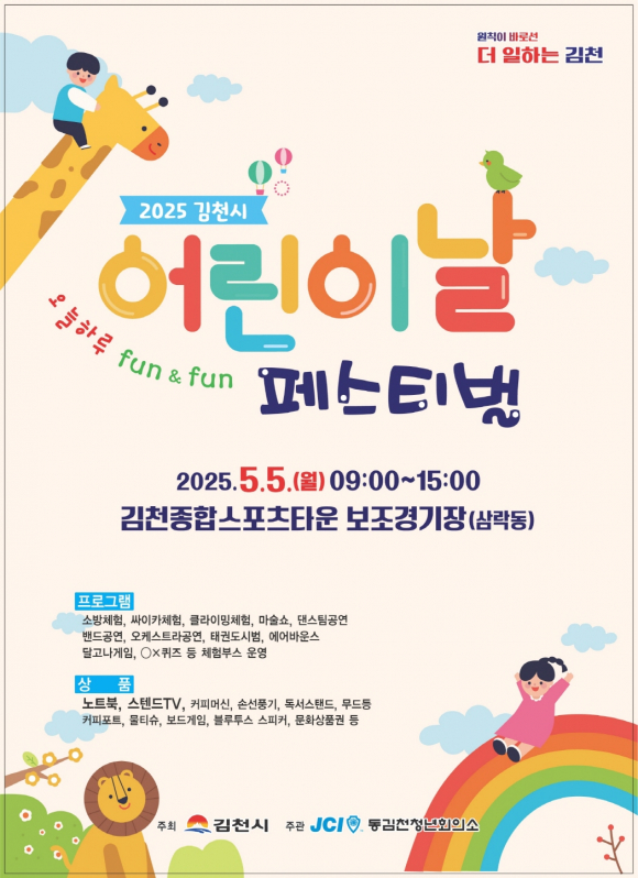 특히 이날 회의에서는 어린이날이 즐겁고 안전한 축제가 되도록 다양한 의견을 논의했으며, 김천소방서에서는 소화기 사용법 등을 교육하여 사고에 대비할 수 있도록 했다. 어린이날 행사는 5월 5일 「오늘하루 fun & fun 페스티벌」이라는 부제로 김천종합스포츠타운 보조경기장에서 기념식, 축하공연, 게임, 홍보·체험 부스, 캐릭터 포토존 등으로 다채롭게 운영될 계획이다.