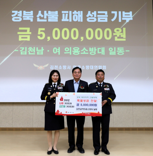 이번 성금은 최근 경북 지역에서 발생한 산불로 삶의 터전을 잃고 실의에 빠져있는 지역 주민들의 아픔을 함께 나누고, 신속한 피해복구를 지원하기 위해 김천 남ㆍ여의용소방대원 549명이 자발적인 참여로 성금을 마련했다.