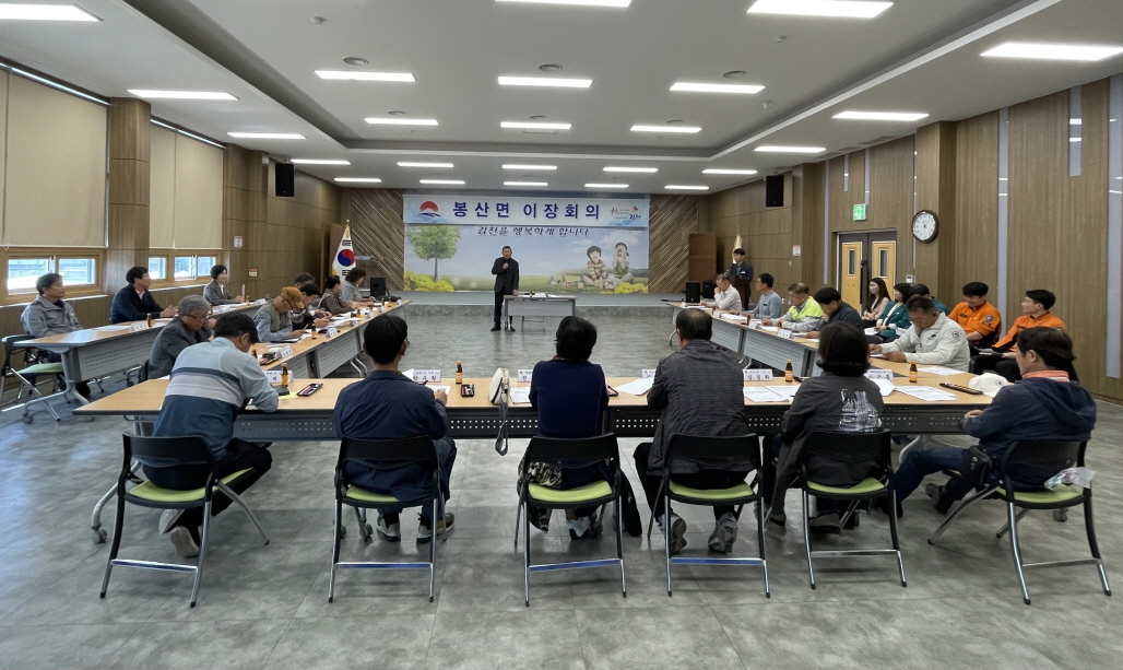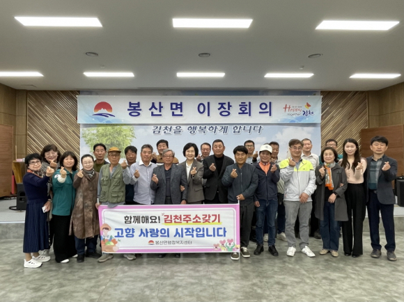 | 김천시 봉산면 이장협의회(회장 박희중)는 지난 4월 17일 봉산면 건강생활지원센터 3층 회의실에서 각 마을 이장 및 주요 내빈 20여 명이 참석한 가운데 4월 정례 이장회의를 개최해 「고향 사랑! 김천 주소 갖기」 운동을 추진했다.