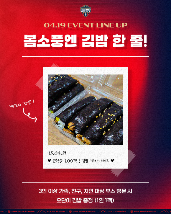 이번 홈경기의 테마는 완연한 날씨에 어울리는 봄 소풍이다. 봄 분위기를 느낄 수 있는 다양한 홈경기 이벤트로 관중을 맞이한다. 먼저 사전 모집된 팬을 대상으로 ‘프로선수와 함께하는 봄소풍’이 진행된다. 레크레이션, 퀴즈와 간식 및 티타임 등으로 시간을 함께할 수 있다. 봄에 생각나는 김밥 증정 이벤트도 있다. 가족, 친구, 지인 등 3인 이상 경기 관람 시 1인당 1팩 ‘오단이 꼬마김밥’을 증정한다.