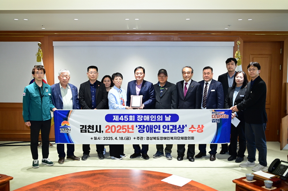 | 김천시가 4월 18일, 2025년도 「제45회 장애인의 날」을 기념하여 장애인 권익 증진에 이바지한 공로를 인정받아 작년에 이어 2년 연속 ‘장애인 인권상’을 수상했다.