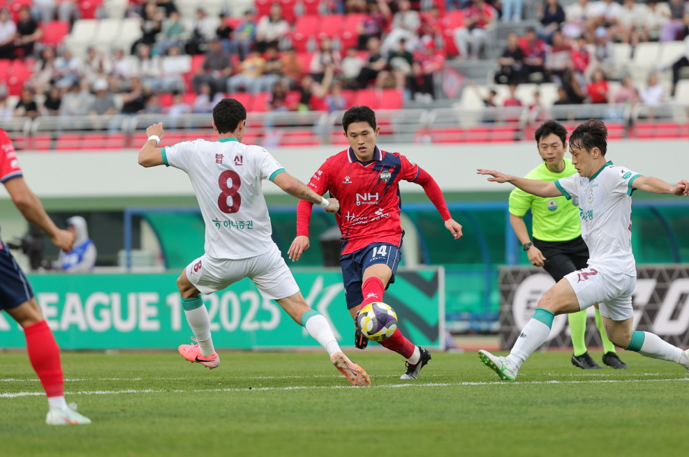 킥오프 후 먼저 기회를 만든 쪽은 김천상무였다. 전반 7분, 이동경이 한 차례 슈팅으로 대전을 위협했다. 이후 흐름은 대전으로 넘어갔다. 김천상무는 상대의 강력한 전방 압박과 촘촘한 수비 간격을 공략하는 것에 어려움을 겪었다. 전반 30분, 스로인 상황에서 이동경을 필두로 공격을 전개하고, 유강현의 슈팅 마무리로 분위기 전환을 시도했다.