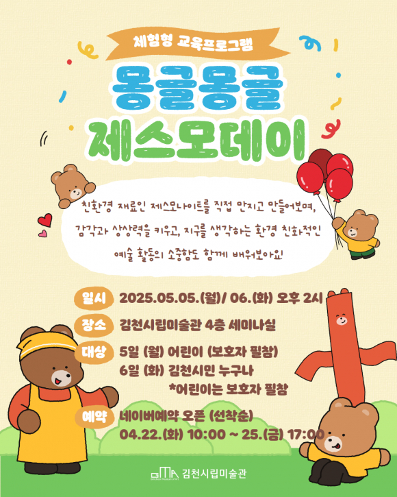 <몽글몽글 제스모데이>는 5일(월)에는 어린이를, 6일(화)에는 김천시민 누구나를 대상으로 오후 2시부터 4시까지 운영되며, 어린이 참가자는 보호자 동반이 필수다. 참가비는 무료이며, 회차당 25명씩 총 50명이 참여할 수 있다. 참여 신청은 4월 22일(화) 오전 10시부터 4월 25일(금) 오후 5시까지 네이버 예약을 통해 선착순 접수한다.