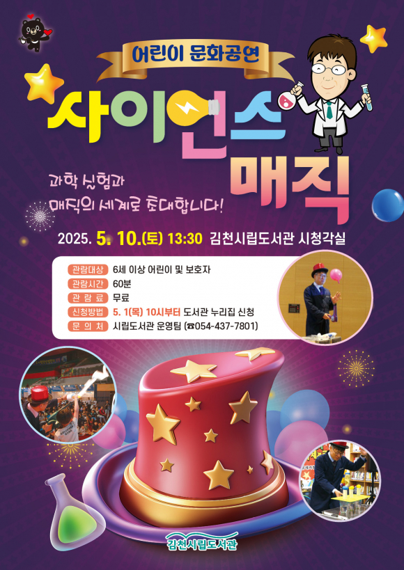 | 김천시립도서관은 5월 가정의 달을 맞아 어린이 양육 가정을 대상으로 문화 체험 기회를 제공하기 위해 오는 5월 10일 도서관 시청각실에서 「사이언스 매직」을 공연을 개최한다.