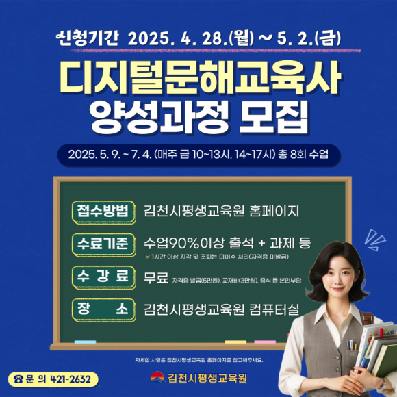 자세한 내용은 김천시평생교육원 홈페이지를 참고하거나 전화(☎054-421-2632)로 문의하면 된다. |