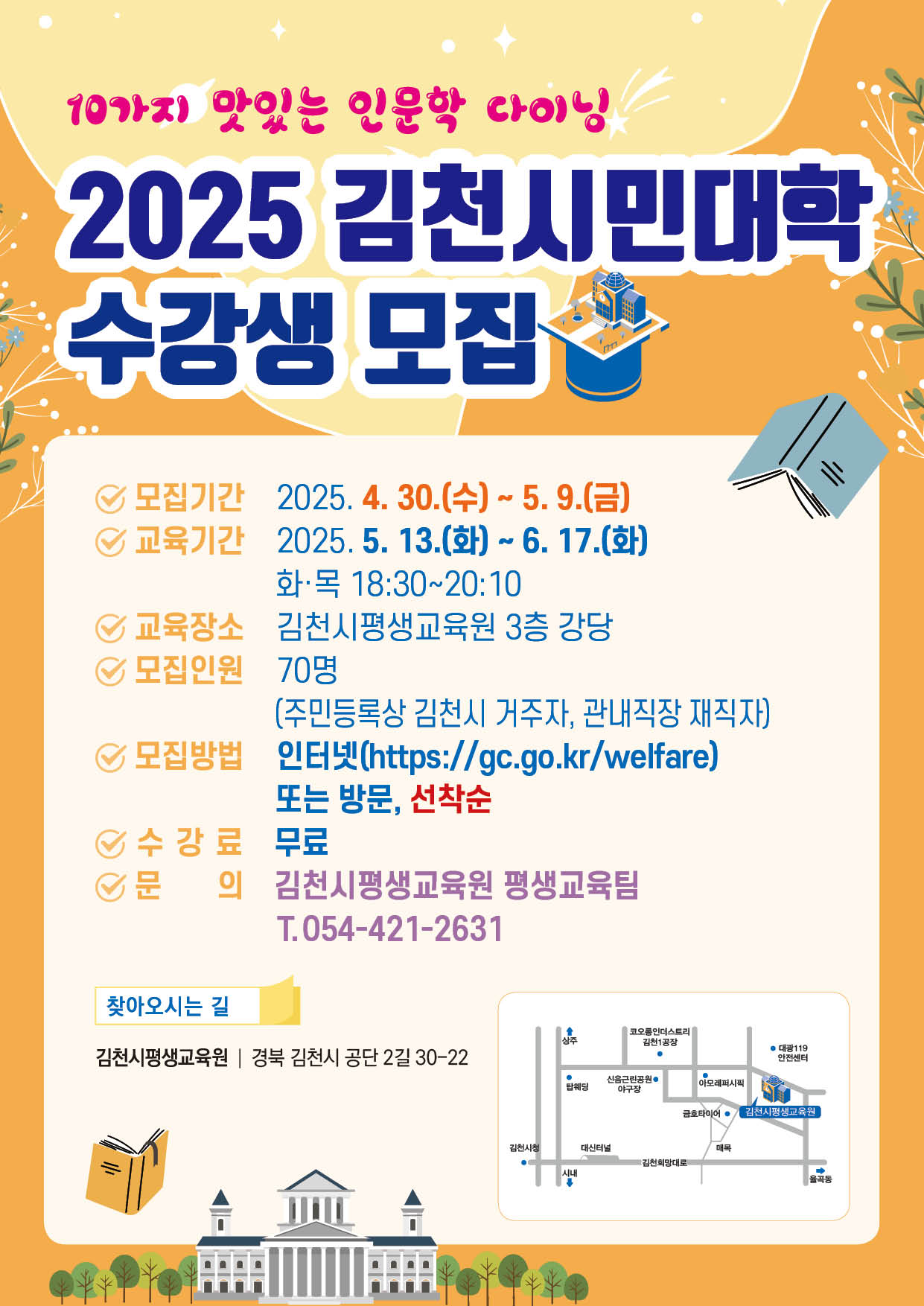 | 김천시평생교육원에서는 시민들의 삶에 인문학의 향기를 더해줄 특별 프로그램 「2025 김천시민대학」 수강생 70명을 오는 4월 30일부터 5월 9일까지 선착순으로 모집한다고 밝혔다.