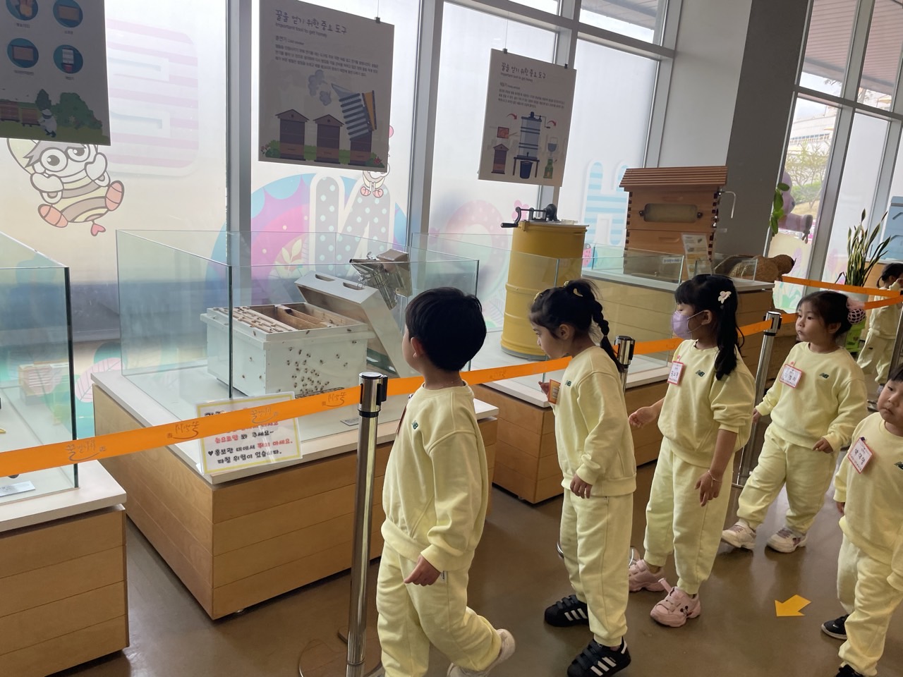 유아들은 꿀벌나라에 도착하여 먼저 ‘꿀벌 생태관’을 관람하였다. 꿀벌의 구조, 역할, 생태주기 등을 눈으로 보고 귀로 들으며 생생하게 배우는 시간을 가졌고, 꿀벌 가족의 다양한 모습을 비교해 보며 “여왕벌은 진짜 크다!”, “일벌이 꿀을 모으는 거였구나!” 하고 감탄을 자아냈다.