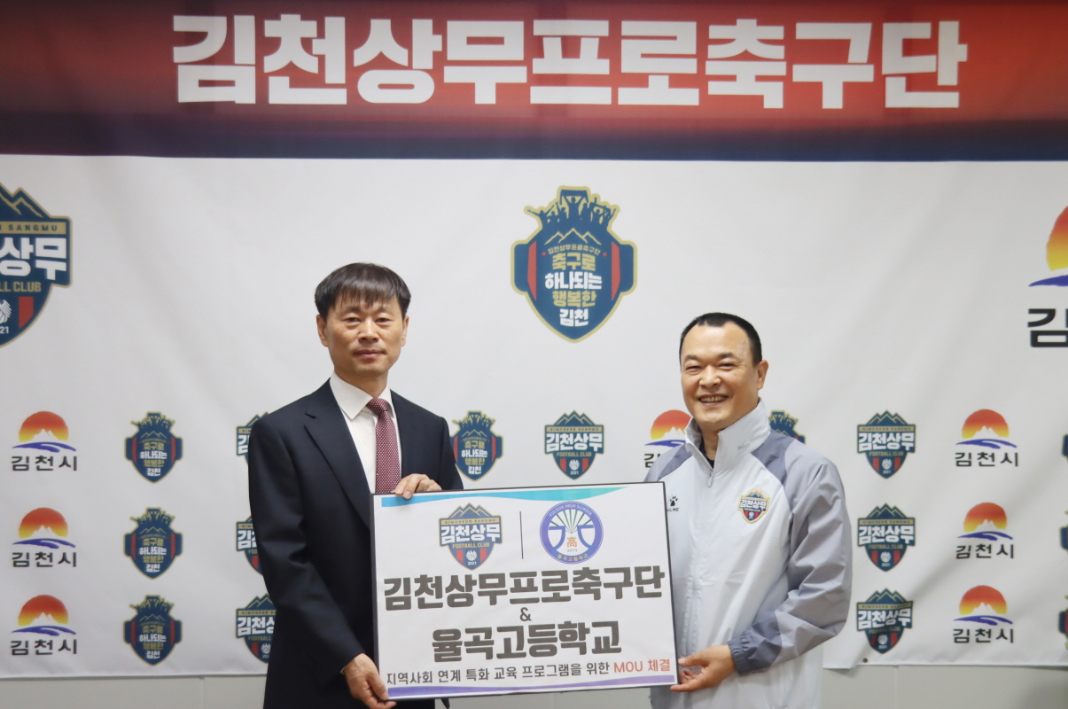 | 김천상무프로축구단이 4월 24일, 김천율곡고등학교와 ‘지역사회 연계 특화 교육 프로그램 운영 및 교육 협력 확대를 위한 업무협약’을 체결했다. 협약식에는 율곡고 이충희 교장과 김천상무 이재하 대표이사가 참석했다.