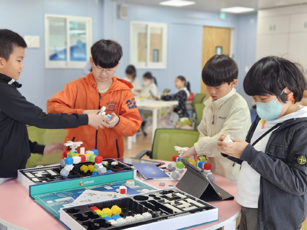 먼저 첫 번째 체험으로는‘코딩 큐브로이드’를 진행하였다. ‘코딩 큐브로이드’ 체험은 앱을 통해 블록코딩을 한 뒤에 자신이 제작한 기기를 코딩대로 동작시키는 활동이다. 미래 사회에서 각광받는 코딩, 로봇 기술과 수학이 접목된 활동을 함으로써 학생들에게 흥미를 이끌게 하고, 진로에 대해서도 생각해 볼 수 있는 의미있는 시간이 되었다.