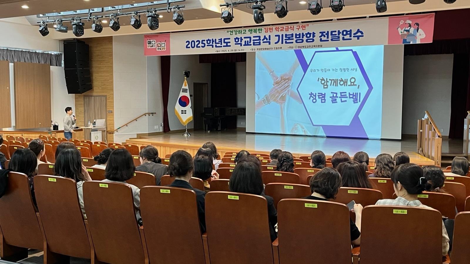 | 경상북도김천교육지원청(교육장 모태화)은 지난 4월 29일 김천학생문화예술센터에서 관내 영양교사 및 영양사 50여명 대상으로 2025학년도 학교급식 기본방향 전달연수 및 청렴연수를 실시했다.