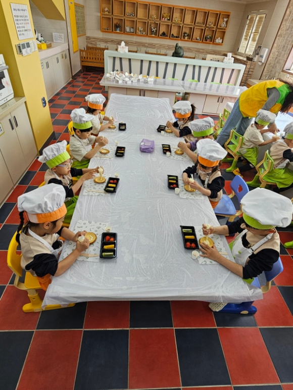 유아들과 함께 과일 타르트 만들기 체험을 함께 하였다. 유아용 앞치마와 모자를 쓰고 선생님의 지도 아래 신선한 계절 과일과 토핑으로 과일 타르트 만들기를 실시하였다. 2층 활동공간에서는 코너별로 준비된 다양한 놀이를 즐겼다. “모래놀이”, “공놀이”, “게임”, “공사놀이”등을 함께 즐기며 즐거운 시간을 보냈다.