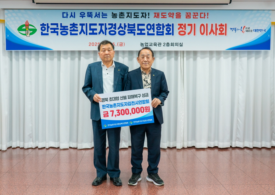 | 한국농촌지도자 김천시연합회(회장 유은상)는 지난 4월 25일 최근 경북 지역에서 발생한 대형 산불 피해 복구를 돕기 위한 성금 730만 원을 한국농촌지도자 경상북도연합회에 전달했다.