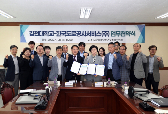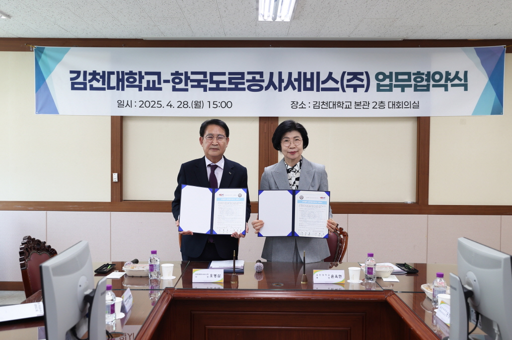 | 김천대학교(총장 윤옥현)에서는 ㈜도로공사서비스주식회사(사장 오병삼)와 K-U시티 사업의 일환으로 지역인재양성 및 혁신기술개발과제 업무협약(MOU) 체결식을 진행하였다고 4월 30일 밝혔다.