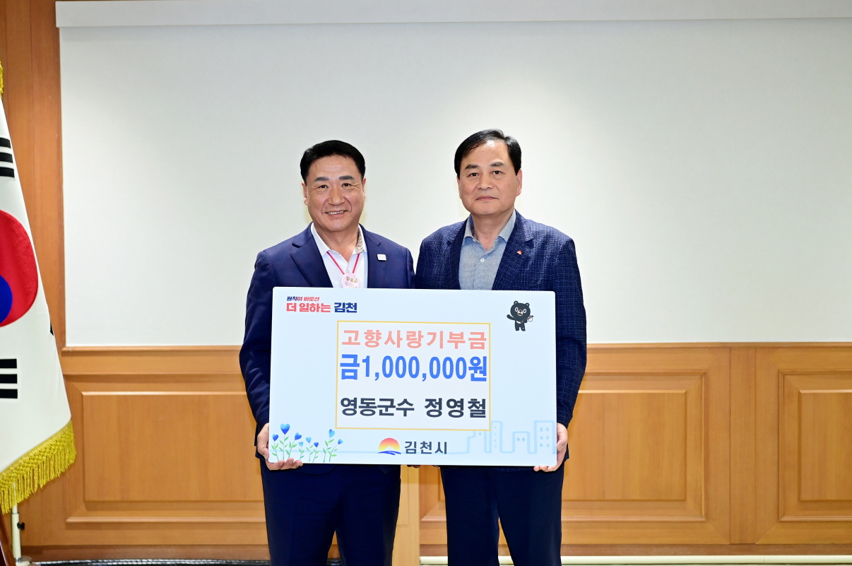 이번 기부는 고향사랑기부제 활성화 및 이웃 지역인 김천시와 영동군이 상호 우호 관계를 다지고자 하는 의미를 담고 있다.