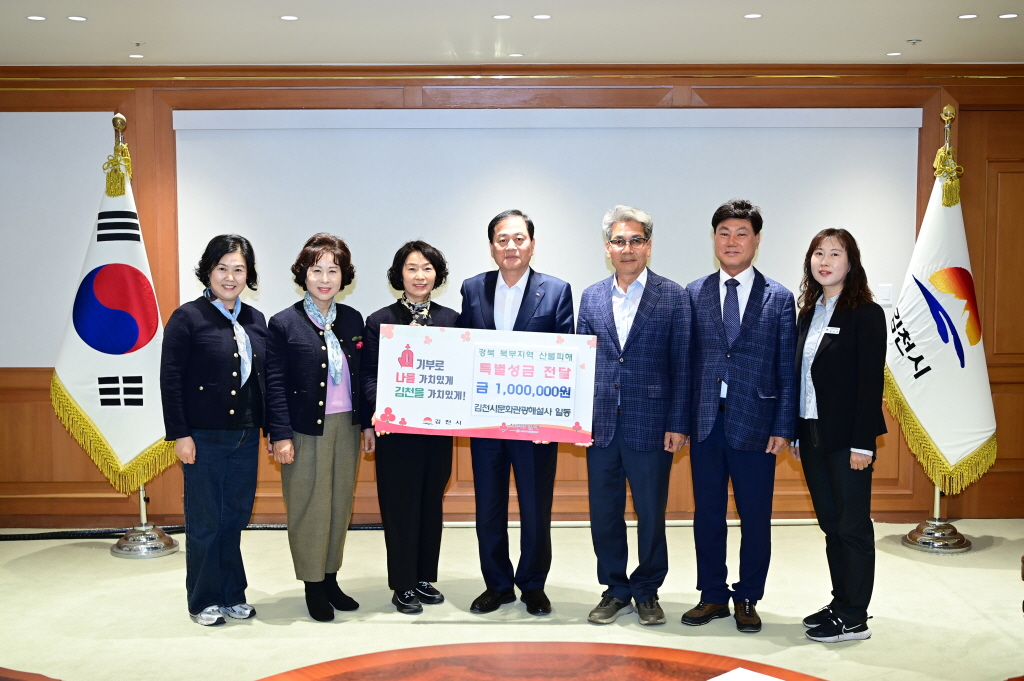 배낙호 김천시장은 “김천을 찾는 관광객들에게 지역의 역사와 문화를 알리는 데 큰 역할을 하고 있는 문화관광해설사분들이 이번에 산불 피해로 어려움을 겪고 있는 이웃을 돕기 위해 마음을 모아 주셨다.”라며, “기부해 주신 성금은 꼭 필요한 곳에 소중히 전달하겠으며, 앞으로도 해설사 여러분이 자긍심을 갖고 활동하실 수 있도록 시에서도 지속적인 관심과 지원을 아끼지 않겠다.”라고 밝혔다.
