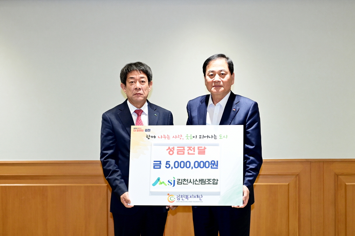 이에 대해 배낙호 김천시장은 “뜻깊은 성금을 전달해 주신 김천시산림조합에 깊은 감사를 드린다.”라며, “기부된 성금은 김천복지재단을 통해 도움이 절실한 이웃들에게 소중히 전달될 예정”이라고 전했다.