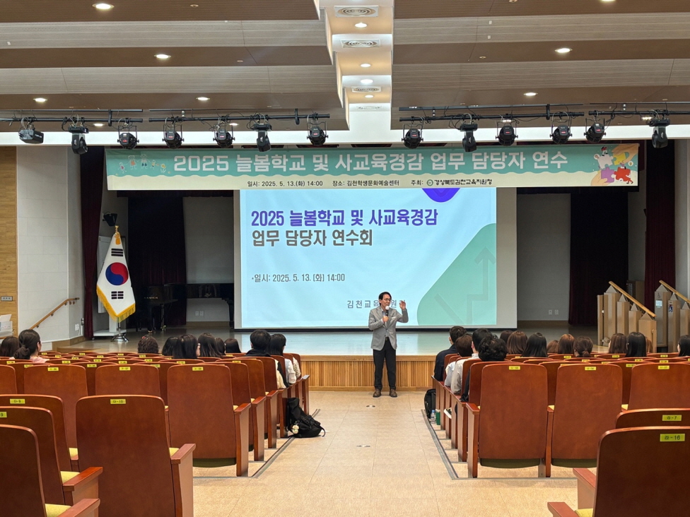 | 경상북도김천교육지원청(교육장 모태화)은 5월 13일 김천학생문화예술센터에서 초·중·고등학교 늘봄학교 및 사교육경감 관련 업무 담당자들을 대상으로 실무 연수를 실시하였다. 이번 연수는 업무 담당자들의 실무 역량을 강화하고, 늘봄학교의 안정적 운영을 위한 협업 체계 구축을 목적으로 마련되었다.
