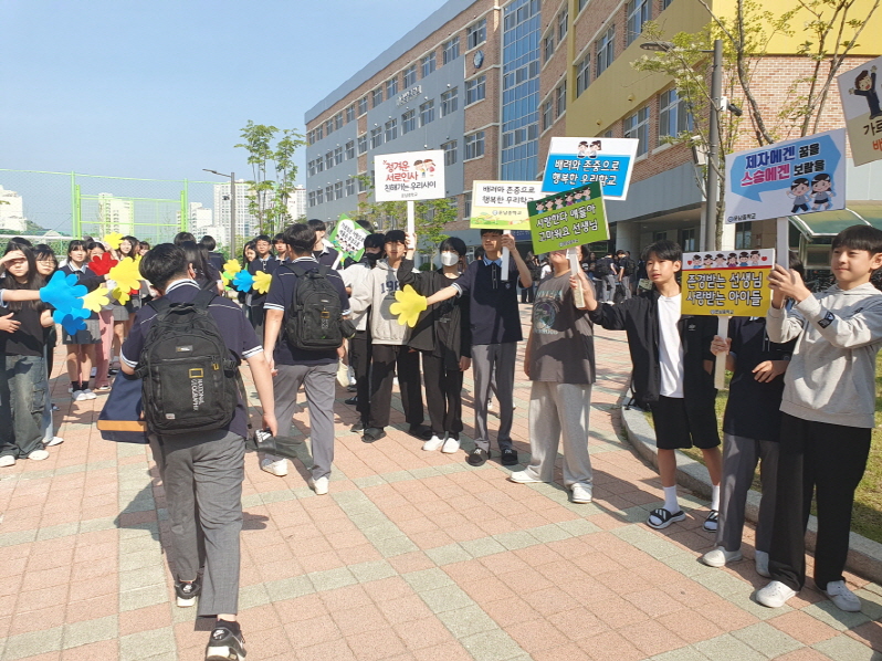 13일 교육활동 보호 캠페인의 일환으로 등굣길 ‘하이파이브 데이’를 운영하여 학생들에게 활기찬 아침을 선물하고, 교사와 학생 간의 친밀도를 높였다. 특히 배려와 존중을 통해 교사와 학생이 함께 행복한 학교의 중요성을 한번 더 인식할 수 있는 계기가 되었다.