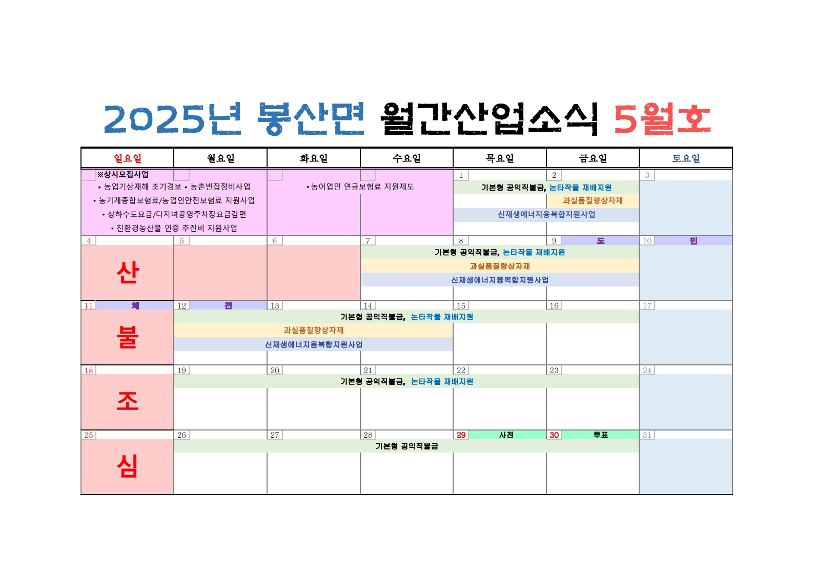 | 김천시 봉산면(면장 이진숙)은 각종 보조·지원사업 정보를 달력 형식으로 정리한 「월간 산업소식」을 발행하며, 민원 대응과 행정업무 효율 향상에 이바지하고 있다.