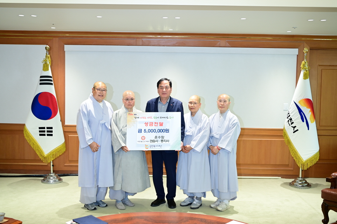 | 김천시(시장 배낙호)는 지난 5월 13일, 대한불교조계종 용화사를 비롯해 운수암, 관음사, 총지사 등 지역 내 4개 사찰이 김천복지재단에 총 700만 원의 성금을 전달했다고 밝혔다.