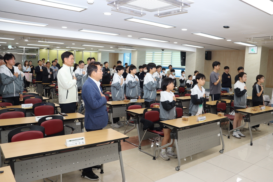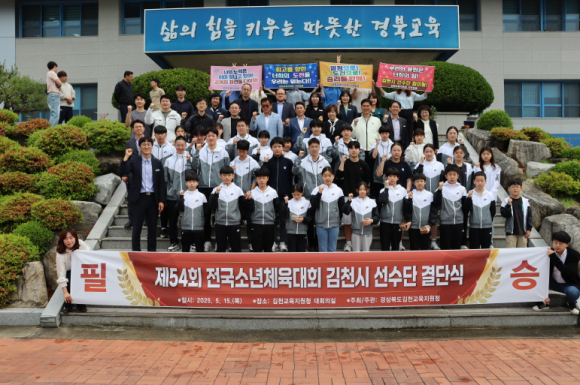 | 경상북도김천교육지원청(교육장 모태화)은 5월 15일 3층 대회의실에서 제54회 전국소년체육대회에 참여하는 선수들을 격려하고 결의를 다지는 결단식을 개최했다. 이날 결단식에는 김천시청 김종현 스포츠산업과장, 김천시체육회 최한동 회장, 각 학교 지도교사, 지도자, 학부모 대표, 교육지원청 관계자 등이 참석해 학생선수들을 격려하고 뜨거운 응원의 메시지를 전했다.