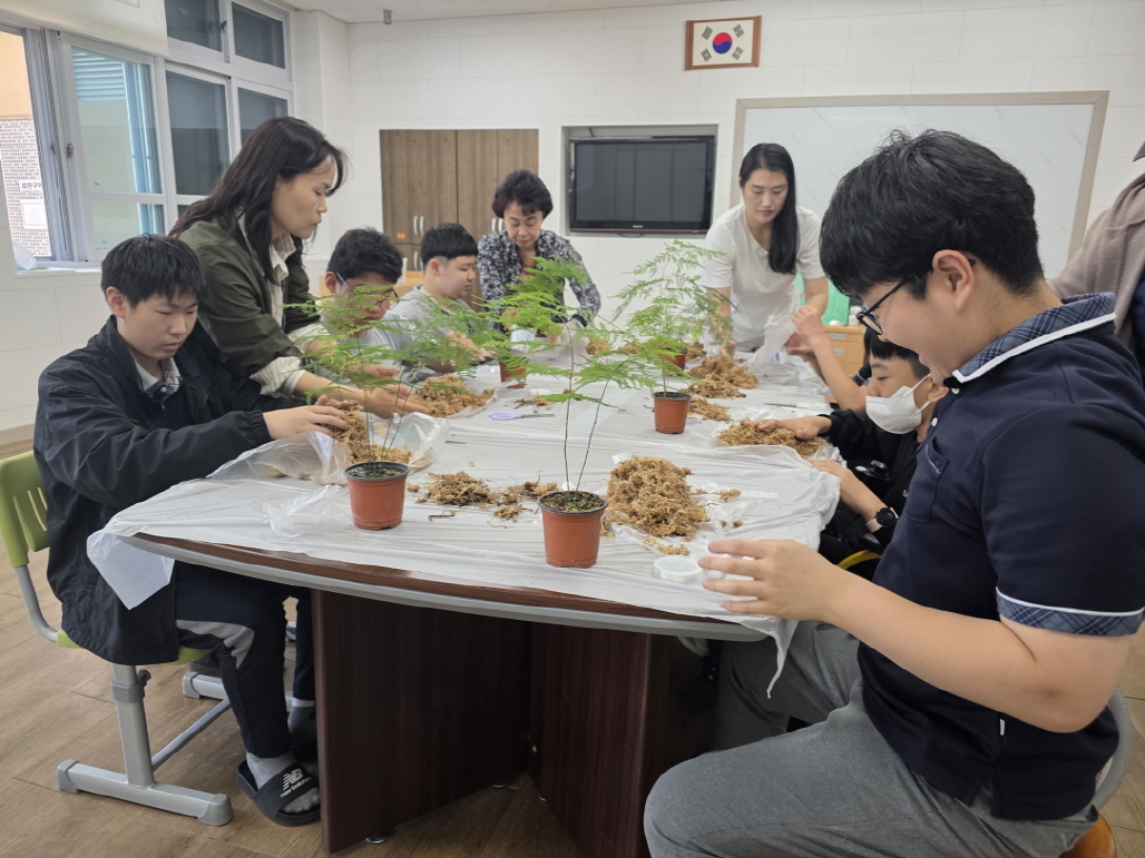 떡과 다과 김○○ 강사는 학생들이 쉽게 접하기 어려운 다양한 떡만들기 체험(찹쌀떡, 백설기, 캐릭터 바람떡)을 장애학생들도 흥미를 가지고 쉽게 체험할 수 있도록 구성하여 천연재료를 사용한 우리나라 전통 음식에 대한 자부심을 심어주며 강의하였다. 원예 김○○ 강사는 수태를 이용한 화분볼 만들기를 통해 촉각과 소근육을 자극하는 체험으로 자연스럽게 다양한 식물의 종류와 명칭을 익히는 기회를 6명의 학생들에게 제공하였다.