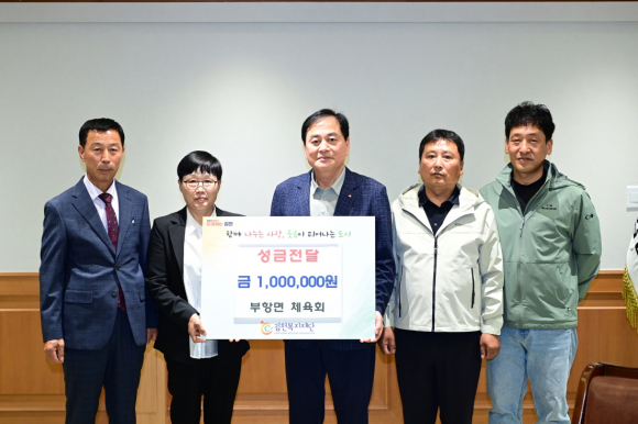 | 지난 5월 16일, 김천시 부항면 체육회(회장 차춘화)와 부항면 방위협의회(회장 오연택)가 김천복지재단에 이웃 돕기 성금 300만 원을 전달했다.