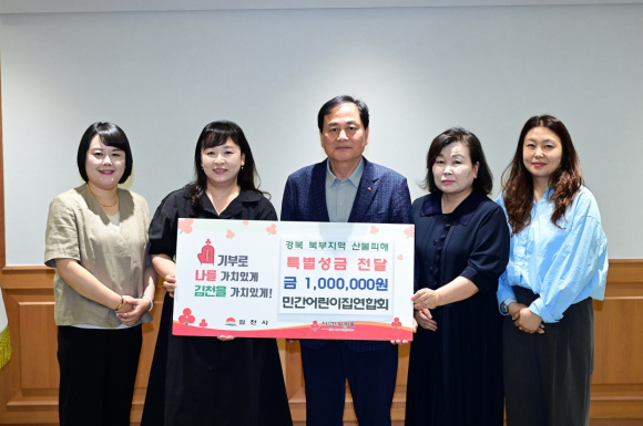 | 김천시(시장 배낙호)는 지난 5월 13일 국공립어린이집연합회에서 김천시복지재단에 100만 원을, 16일 민간어린이집연합회에서 산불 피해 성금과 김천복지재단에 200만 원을 기부했다고 밝혔다.