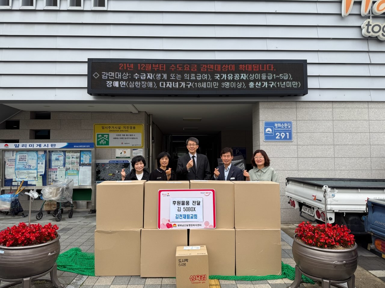 | 김천재림교회(목사 권영섭)는 지난 5월 15일, 관내 어려운 이웃들을 위해 김 선물 세트 50상자를 평화남산동 행정복지센터에 전달했다. 김천재림교회는 매년 지역사회의 도움이 필요한 이웃들에게 다양한 생활 물품 등을 기부하며 사회공헌 활동을 지속적으로 실천하고 있다. 이번에 기부된 물품은 관내 복지 사각지대에 놓인 저소득층 50가구에 전달될 예정이다.