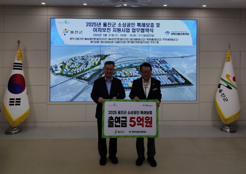 | 경북신용보증재단과 울진군은 5월 21일, 경기 침체로 자금조달에 어려움을 겪는 울진군 지역 소상공인 금융지원을 위해‘2025 울진군 소상공인 특례보증 업무협약’을 체결했다.