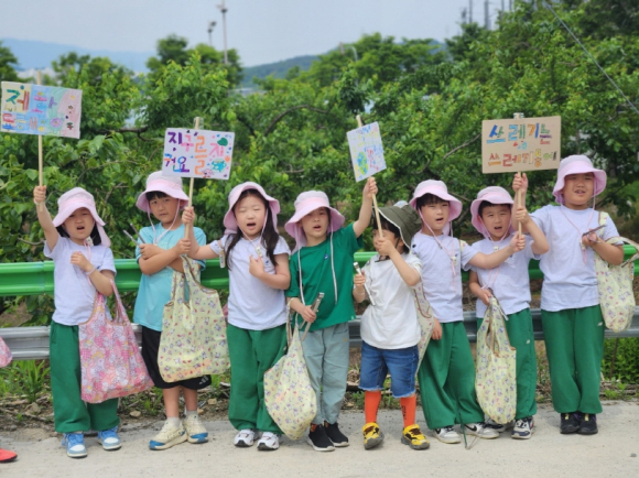 유아들은 유치원 인근 남면 행정복지센터까지‘거북이처럼 천천히’걸으며 쓰레기를 줍는 플로깅(plogging) 및 캠페인 활동을 펼쳤다. 또 평소 가정과 유치원에서 모은 우유 팩과 건전지를 장바구니에 담아 행정복지센터에 가져가 쓰레기봉투와 교환하는 재활용 체험 교육도 함께 진행해 환경 보호의 실천력을 높였다.