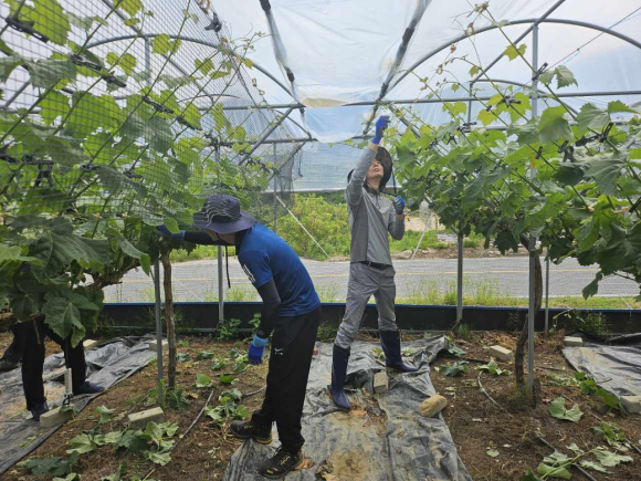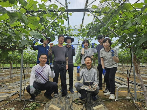 | 김천시 원도심재생과 직원들은 지난 5월 22일 조마면의 한 포도 재배 농가에서 농촌 일손 돕기 봉사활동을 실시했다.