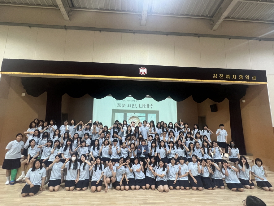 | 김천여자중학교는 5월 27일, 풀꽃 시인으로 널리 알려진 나태주 시인을 초청하여 전교생과 교직원을 대상으로 인문학 강연 활동을 실시하였다.