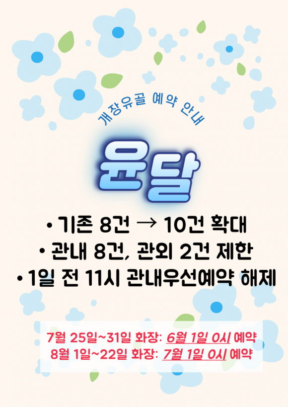 김천시립추모공원은 윤달 기간 동안 개장유골 화장 건수를 기존 1일 8구에서 10구로 확대 운영하며, 김천시민을 대상으로 한 우선 예약제도 함께 시행한다. 7월 예약은 2025년 6월 1일 0시부터 가능하며, 8월 예약은 2025년 7월 1일 0시부터 e-하늘 장사정보시스템을 통해 가능하다.