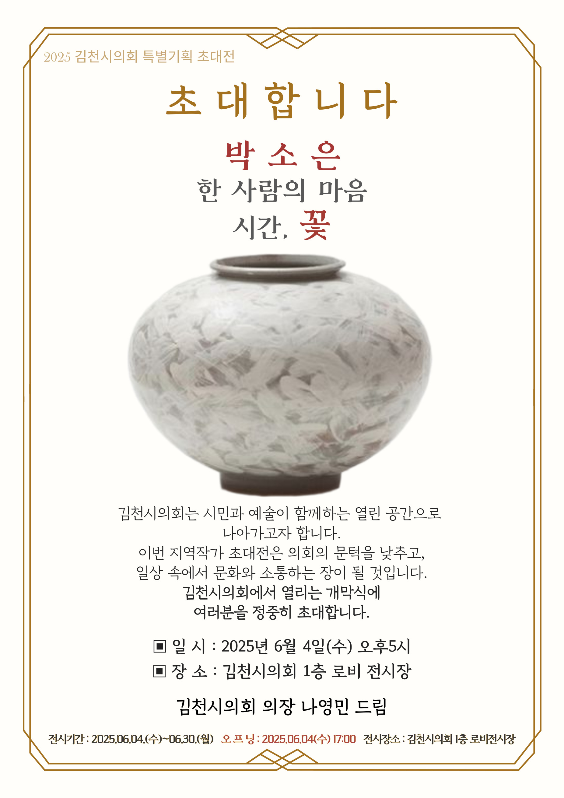 그동안 김천시의회는 2019년 김대철 명인의 도예작품 초대전, 2024년 경로당 어르신 작품 전시회를 열었으며, 이번 초대전을 통해 의회의 문턱을 낮추고 시민들이 자연스럽게 머물며 소통과 공감할 수 있는 공간, 삶에 여유를 더하고 누구나 찾고 싶은 의회를 만들어 나가고자 한다.