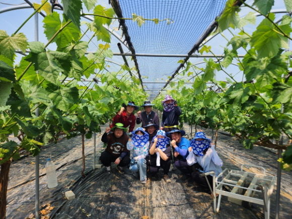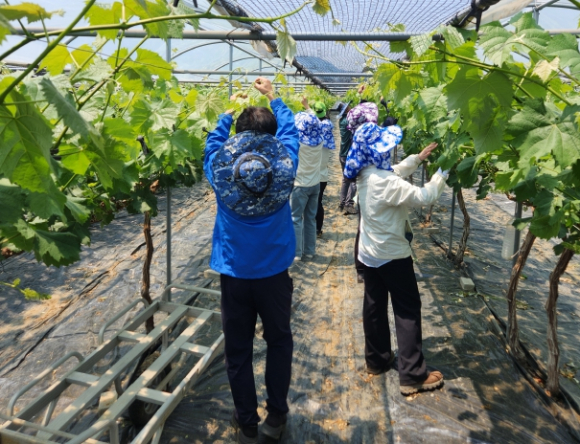 | 김천시 자원순환과(과장 강성규) 직원 10명은 지난 5월 27일 대항면 대룡리 소재의 포도 농가를 방문해 포도 순 따기 작업을 도우며 구슬땀을 흘렸다.