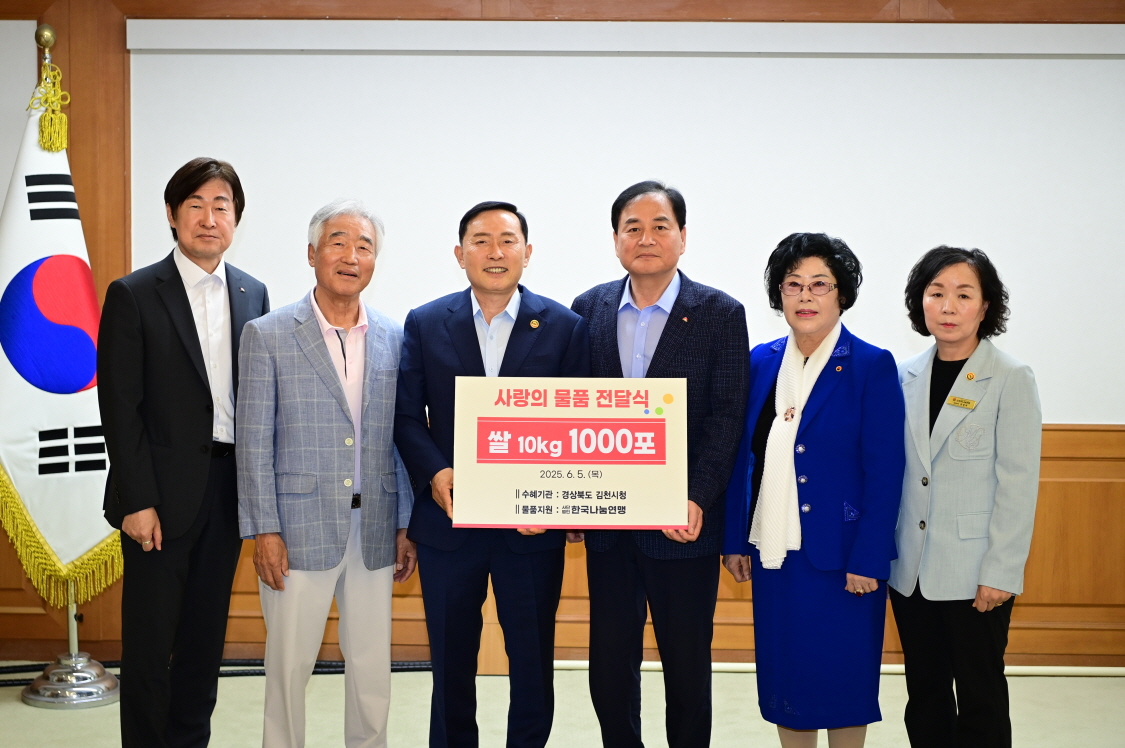 | 김천시는 지난 6월 5일, (사)한국나눔연맹(이사장 안지애)으로부터 백미 10kg 1,000포(3,000만 원 상당)를 전달받았다고 밝혔다.