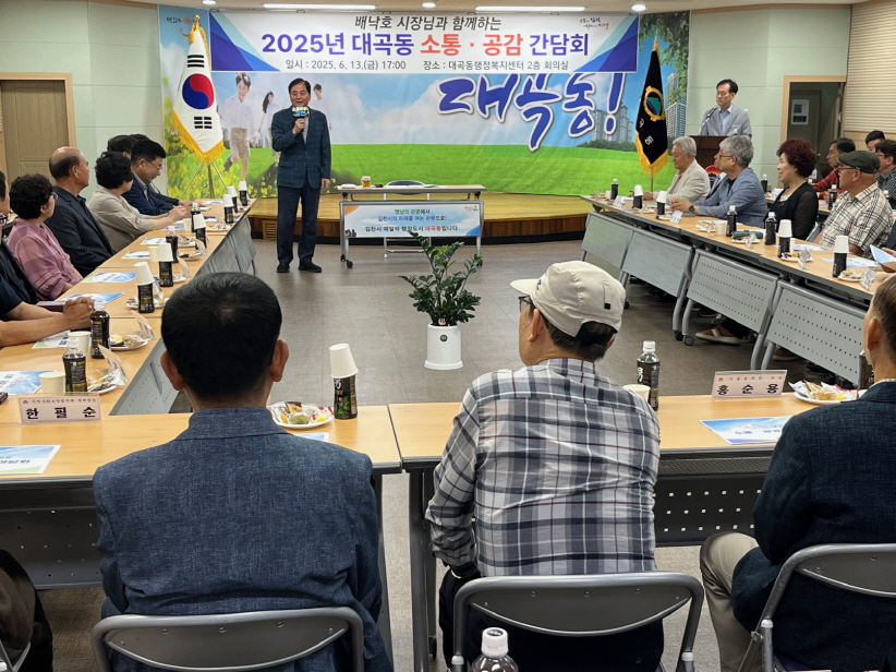 | 지난 6월 13일 대곡동 행정복지센터에서 배낙호 김천시장과 주민 50여 명이 함께하는 ‘2025년 대곡동 소통‧공감 간담회’가 열렸다. 이번 간담회에서는 배 시장이 대곡동을 방문하여 직접 주요 공약과 새로운 시정 운영 방향을 설명하고, 주민들의 각종 건의 사항과 시정 발전 방안에 대한 의견을 들었다.