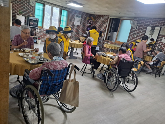 이날 활동을 위해 모인 유산노인봉사단 회원 20여 명은 궂은 날씨에도 불구하고 본향원 진입로 풀베기, 식사 보조 활동, 말벗 되어드리기 등을 진행하며 입소자들과 함께 즐거운 시간을 가졌다.