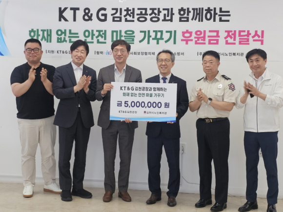 KT&G 김천공장은 지역사회 복지 증진을 위해 지난 5월에도 4곳의 복지기관ㆍ시설에 각 5백만 원씩 총 2,000만 원의 후원금을 전달했으며, 이번 후원금은 김천시노인복지관과 김천재가노인통합지원센터에 △소방 사각지대 농촌마을 단독경보형 감지기 및 분말소화기 지원 △관내 노인 대상 건강관리 용품 세트 지원에 사용될 예정이다.