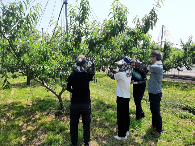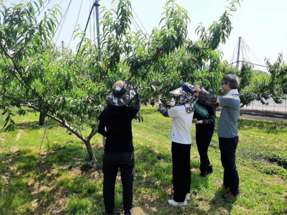 이날 일손 돕기에 참여한 박종기 자산동장 외 직원 10여 명은 서툰 손길이지만 농가에 도움이 되기 위해 구슬땀을 흘리며 복숭아 수확 및 선별 작업을 도왔다. 또한 미리 준비한 간식을 농가주와 함께 나누면서 농번기 인력난 등 애로사항을 공유했다.