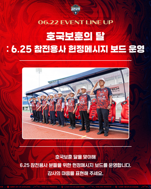 김천상무는 6.25 참전영웅과 이번 홈경기를 함께 한다. 먼저 장외 구역에서는 참전영웅의 김천상무 호국보훈 유니폼 화보 사진전이 열린다. 또한, 참전영웅께 헌정하는 메시지 보드를 운영한다. 호국보훈의 의미를 되새길 수 있는 태극기 색칠 이벤트도 있다.