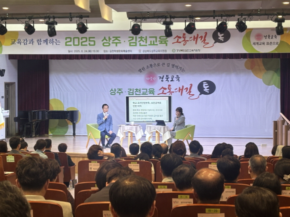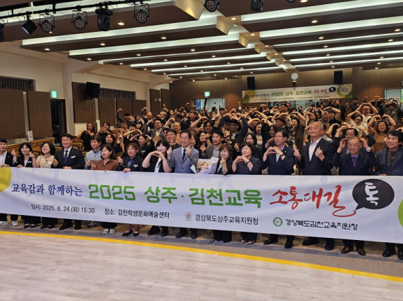 | 경상북도김천교육지원청(교육장 모태화)은 6월 24일 김천학생문화예술센터에서 김천시장, 도의회 의원, 시의회 의장을 비롯한 김천, 상주 지역 각급 학교장, 학교운영위원장협의회장, 학부모회협의회 대표, 녹색어머니회, 학부모자원봉사자회, 주민감사관, 교육계 원로, 교육발전특구 관계자 등 교육가족 240여 명을 초청하여 ‘2025 교육감과 함께하는 상주·김천교육 소통대길 톡’을 개최하였다.